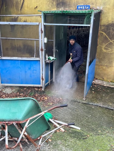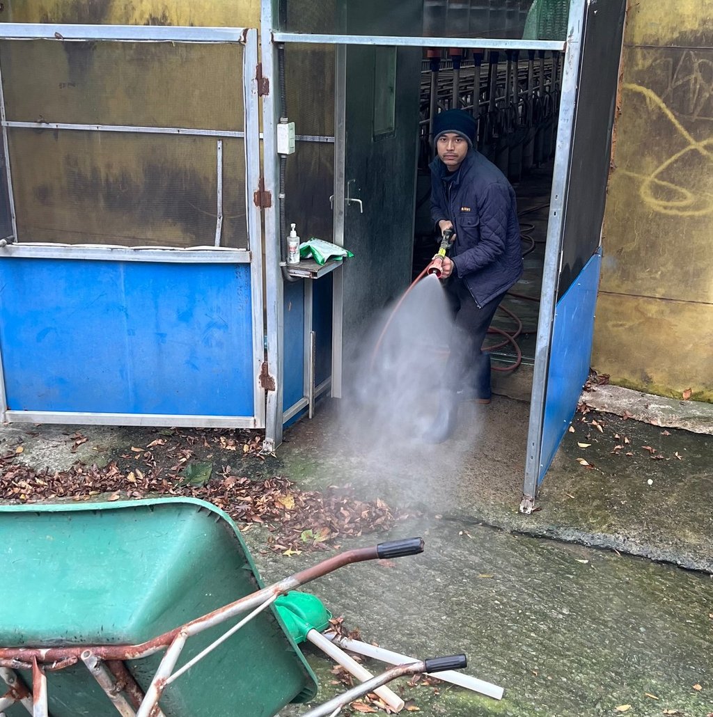 Spraying EM solution inside pig pens helps break down waste and reduce odor.